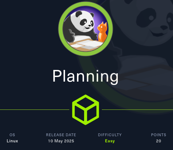 User Flag This machine gives us default credentials: admin / 0D5oT70Fq13EvB5r Let’s start with the traditional nmap scans: sudo nmap -p- --min-rate=1000 -oN nmap.out 10.129.214.74 sudo nmap -p22,80 -sC -sV -vv -oN nmap_scripts.out 10.129.214.74 In port 80 we have a redirect to http://planning.htb We can also find the vhost grafana: ffuf -w /usr/share/wordlists/SecLists/Discovery/DNS/namelist.txt -u http://planning.htb -H "Host: FUZZ.planning.htb" -fs 178 | tee ffuf_dns_namelist_planning.out We can use the credentials provided to login to grafana:...