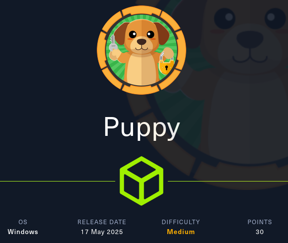 User Flag For this box we are given the credentials: levi.james / KingofAkron2025!. Let’s start with some nmap scans: sudo nmap -p$ports -sC -sV -vv -oN nmap_scripts.out puppy.htb Looking at the SMB, we can find a DEV share, but we don’t have permissions: netexec smb puppy.htb -u usernames.txt -p passwords.txt --shares We can also find more users: Let’s collect some domain information with bloodhound: python ~/workspace/tools/BloodHound.py/bloodhound.py -d puppy.htb -c all -u 'levi....